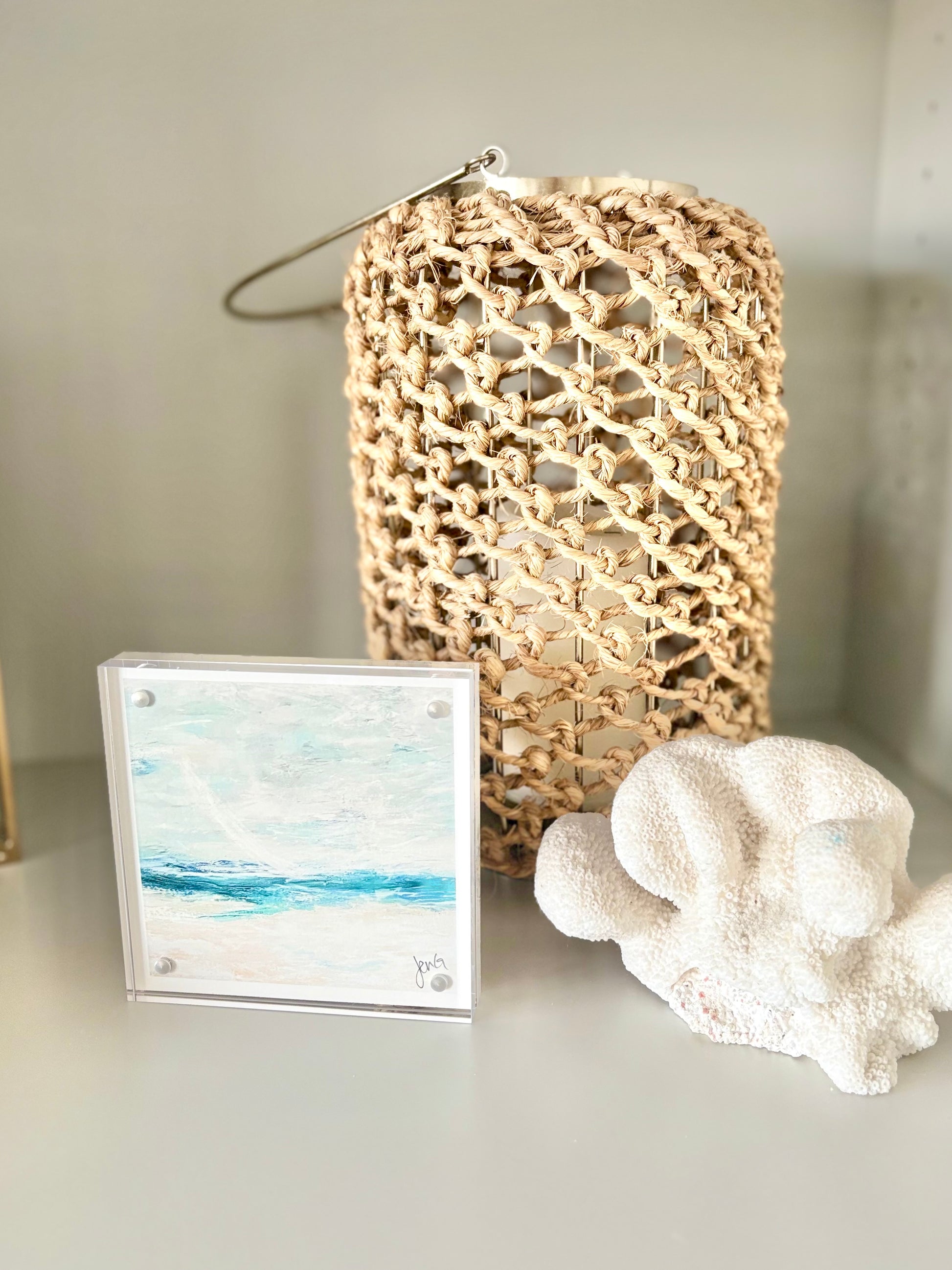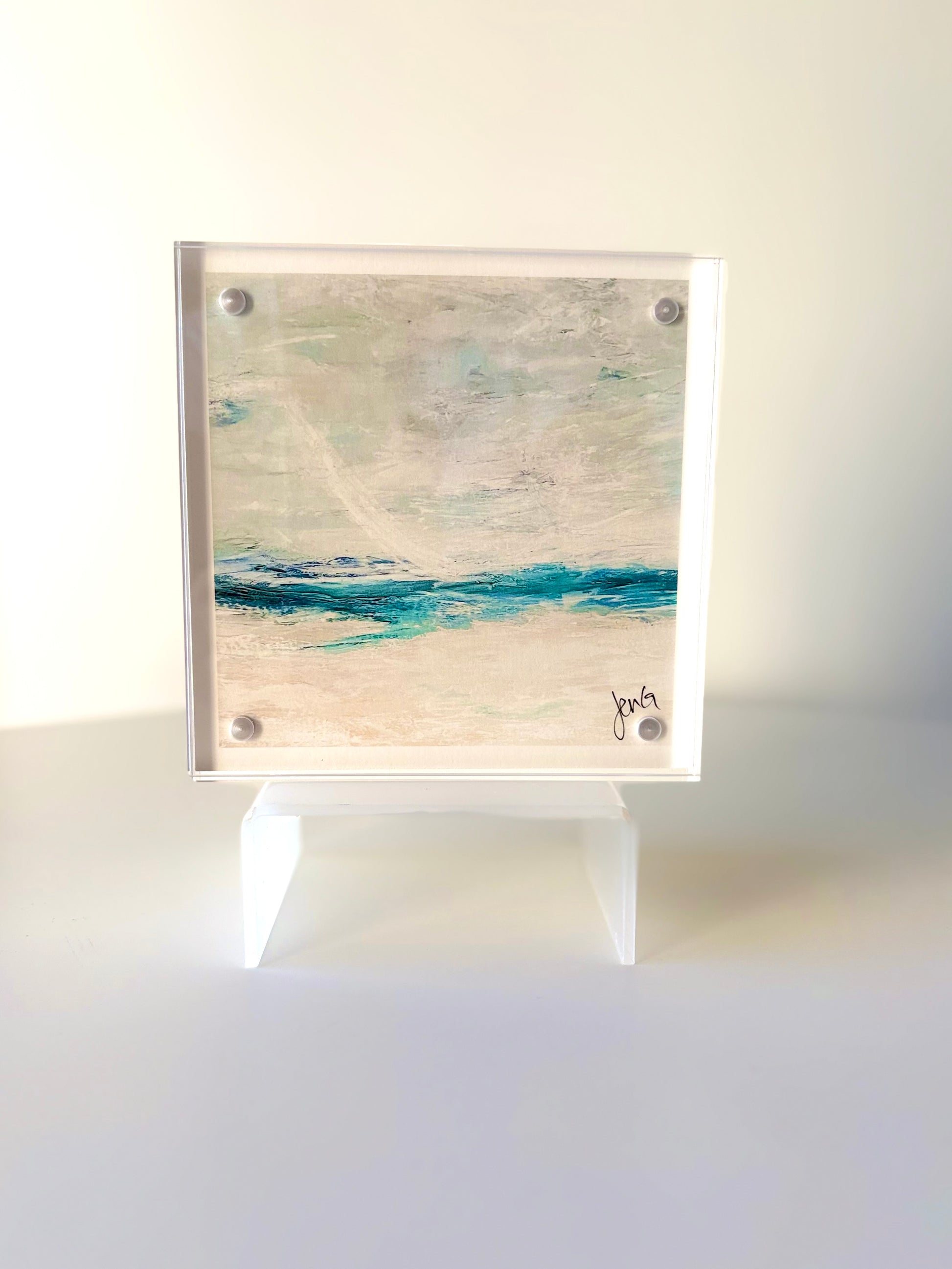 Each luminous 5” acrylic-framed print is created from an original encaustic wax painting. Perfect for displaying on a shelf or desk, each piece brings the beauty, calm, and tranquil spirit of the beach into everyday life.