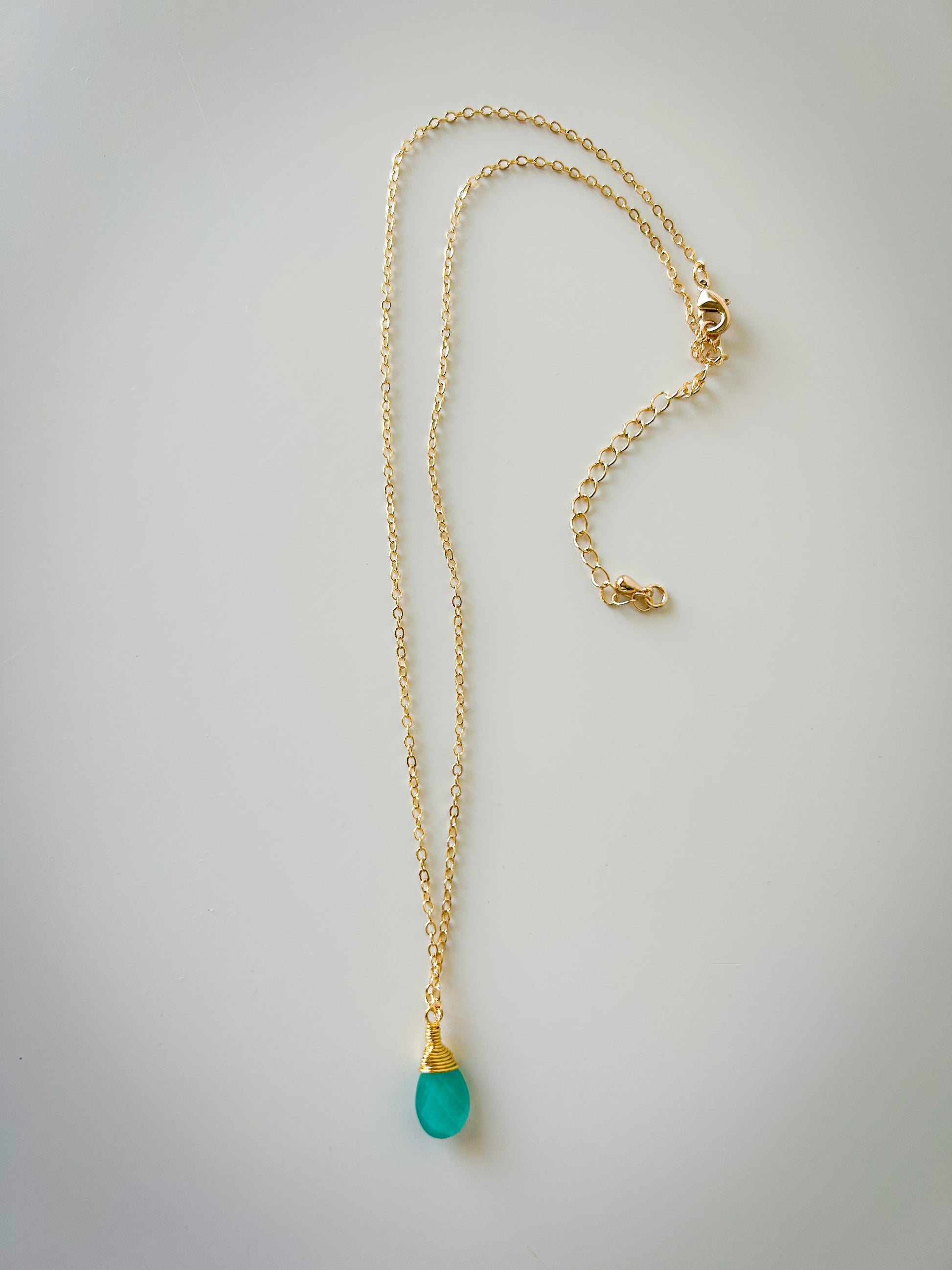 This dainty gold-filled necklace features a lovely aqua chalcedony pendant. Measuring 16 inches, this necklace has an attached 2.5 inch extender so you can pick the length for it to lay perfectly.