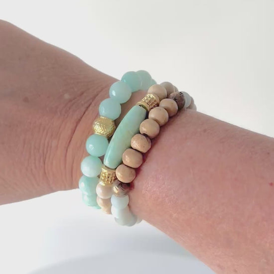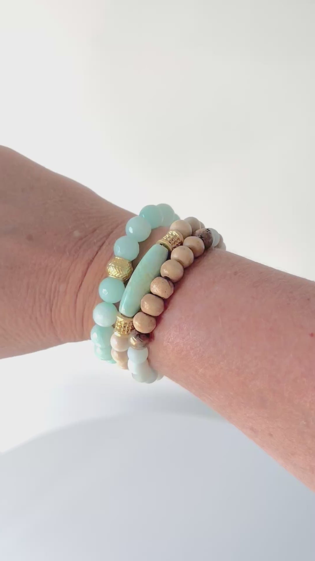 - Set of Three Beaded Bracelets — One-of-a-kind designs featuring natural stone, wood, Amazonite, and bone beads for a touch of organic texture and elegance.